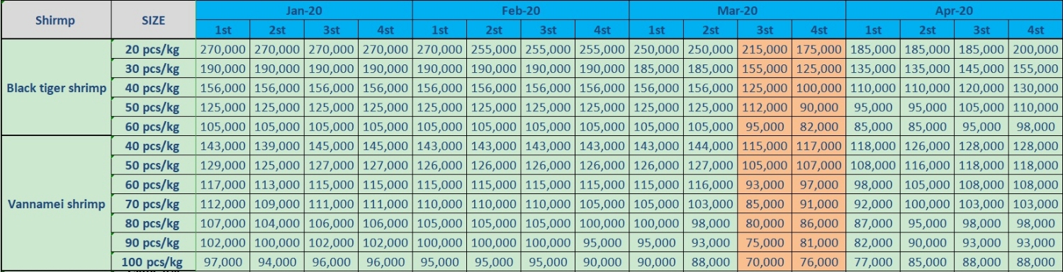 + Prices of Vannamei are being stable in this week, maybe farmers are harvesting much in recent days or big factories are storing much now!