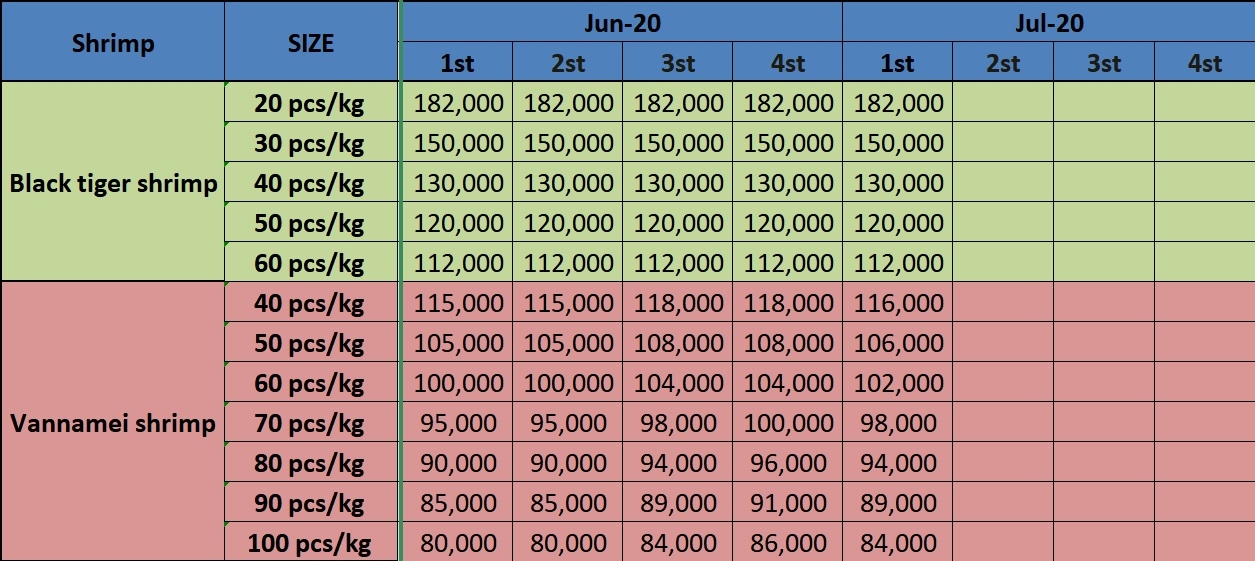 Update the prices of raw material Vannamei and Black tiger shrimp in Mekong delta on July 13, 2020