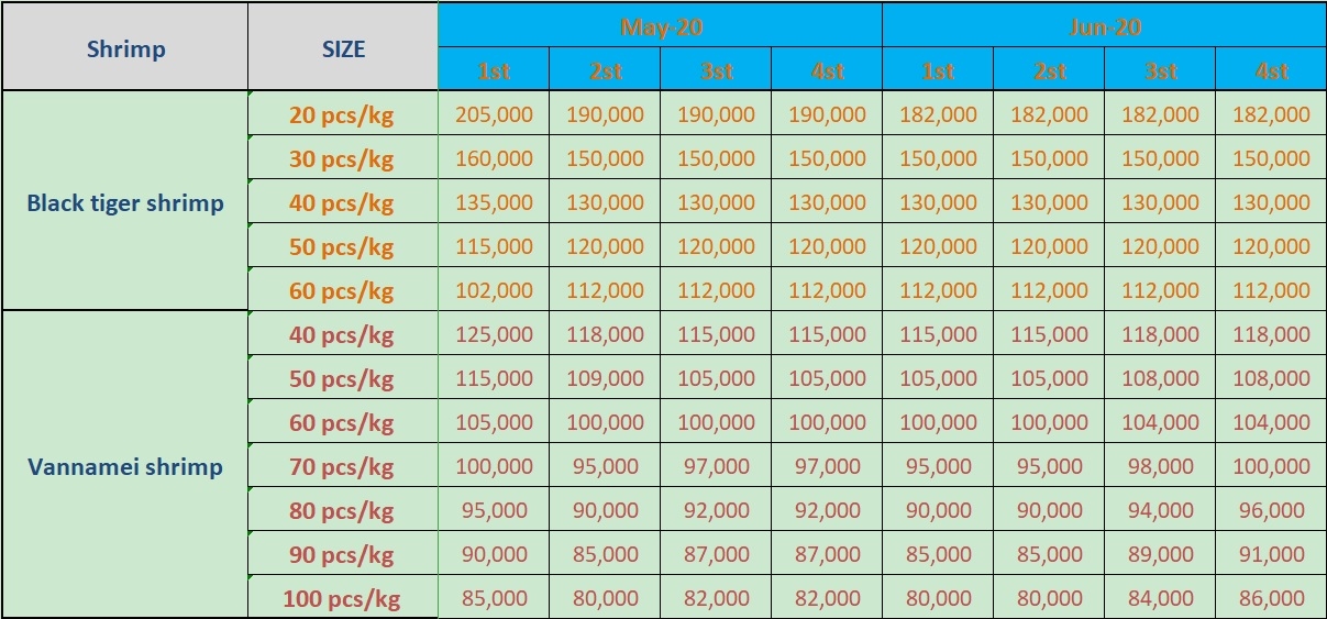 + Prices of big-size Vannamei shrimp are lowering because the demand of big-size shrimp for foodservices is still weak even some countries lifted lockdowns. Meanwhile, the prices of small sizes are being stable or increasing 1000 – 2000 vnd/kg because many factories are having orders for the small-size shrimp