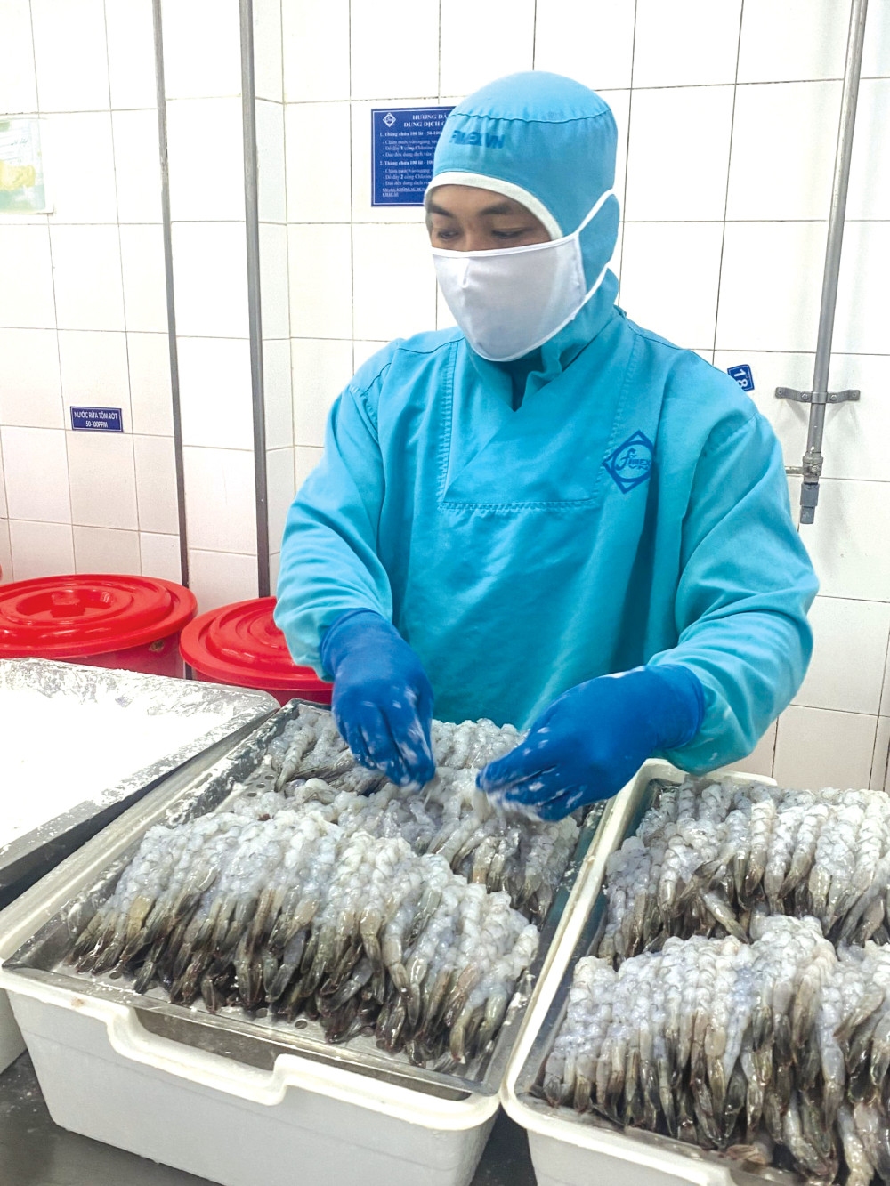 Chuyển hướng thị trường gần và phát huy lợi thế chế biến sâu để duy trì sản xuất, giữ vững thị phần là giải pháp đang được các doanh nghiệp ngành thủy sản áp dụng để vượt khó. Trong ảnh: Chế biến tôm tại Công ty Cổ phần thực phẩm Sao Ta.